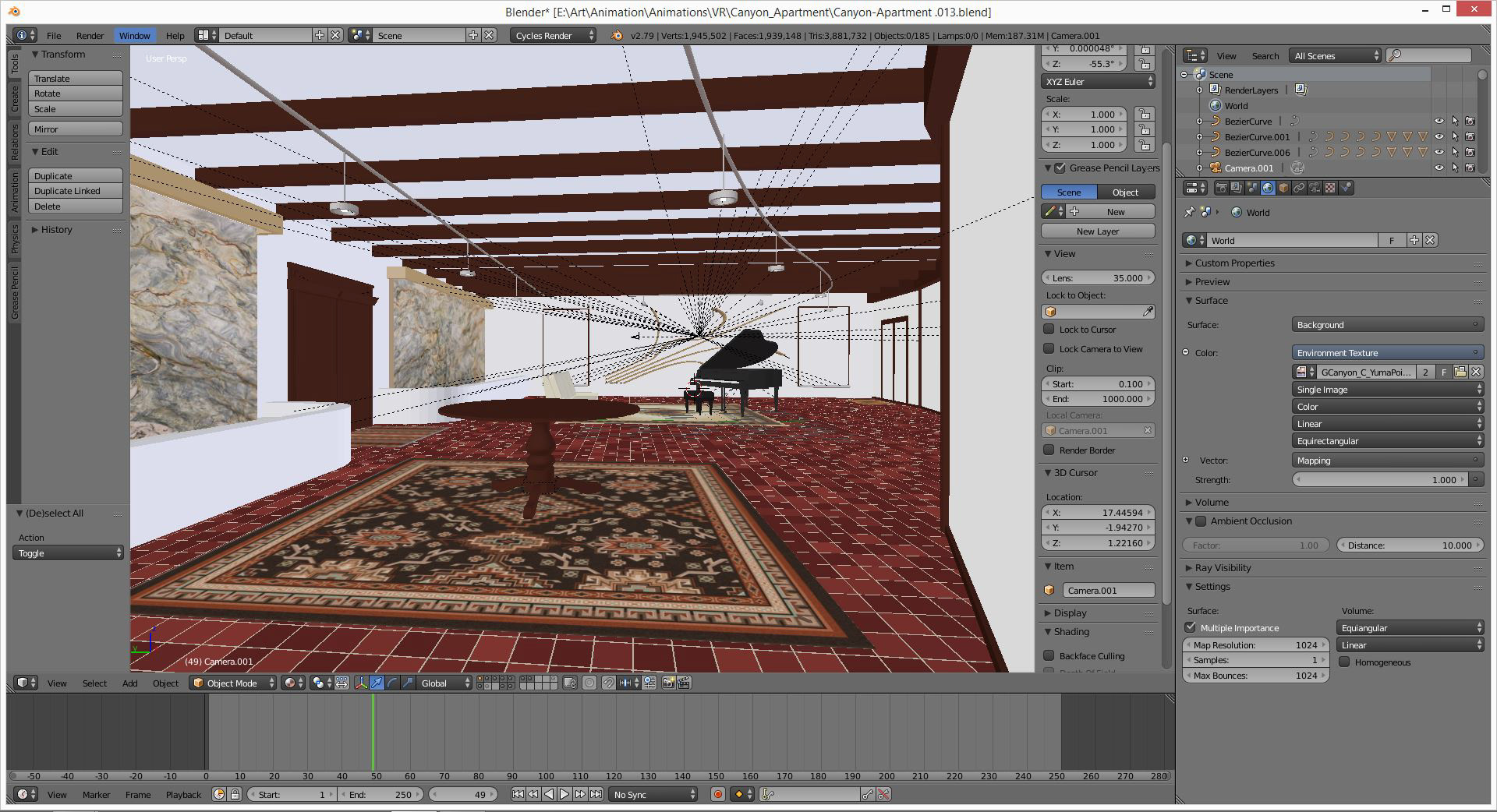 The two fountains opposite the window take inspiration from natural waterfalls with their stone backdrop. The golden sculptural piece on the wall nearest the piano represents the desert wind. Through the glass wall is a view of a natural canyon (the Grand Canyon, for lack of more realistic canyon HDRI image), one of the most majestic formations the landscape of the American West has to offer.